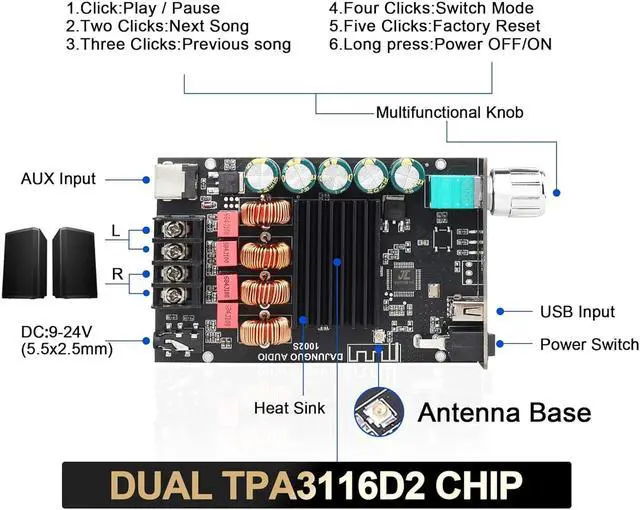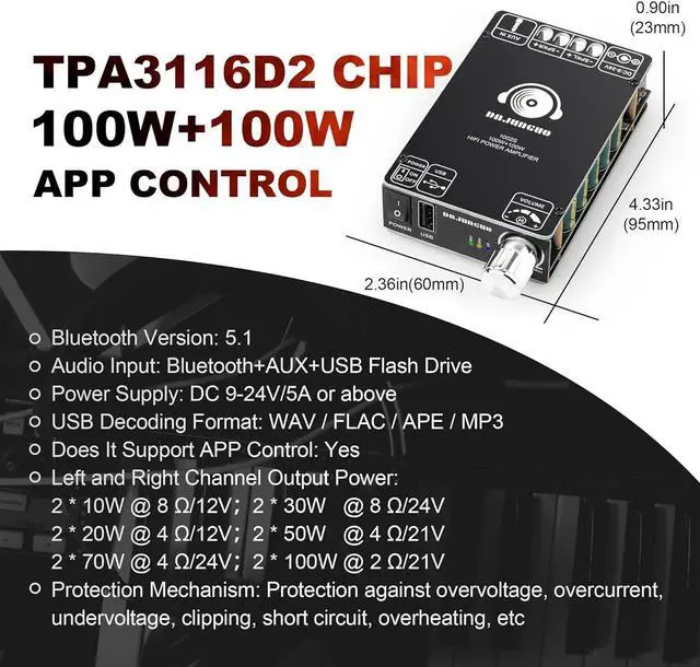 Dual Hifi-grade TPA3116D2 ChipsThis amplifier board features two TPA3116D2 chips, offering a wide voltage input range: DC 9-24V, with a peak output of 100W+100W @ 1kHz, 21V, 4-ohm speakers.