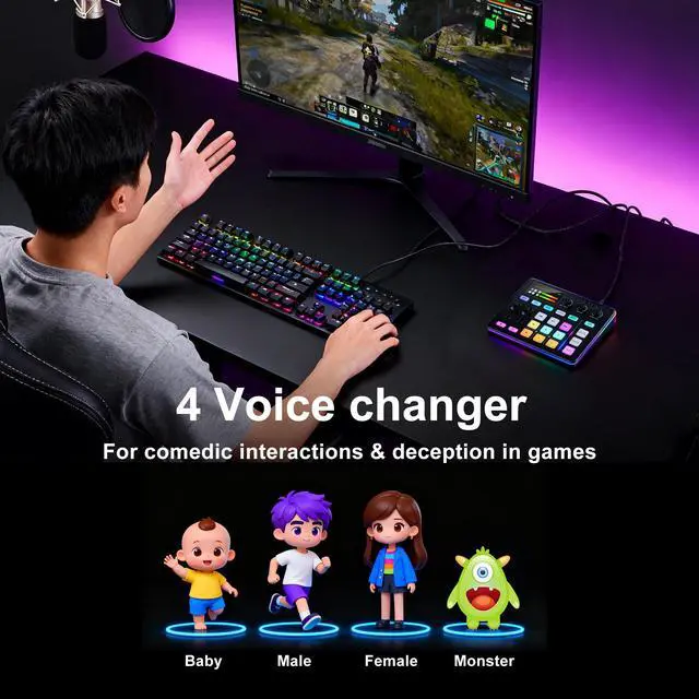 Customize your Sound EffectThe voice change feature of the game audio mixer will bring you a whole new dimension to your gaming streams. "Female, male, baby, and Monster" are available for selection. Creating an engaging and entertaining experience for your viewers. Even can use the reverb and sidechain features to sing a song to your teammates.