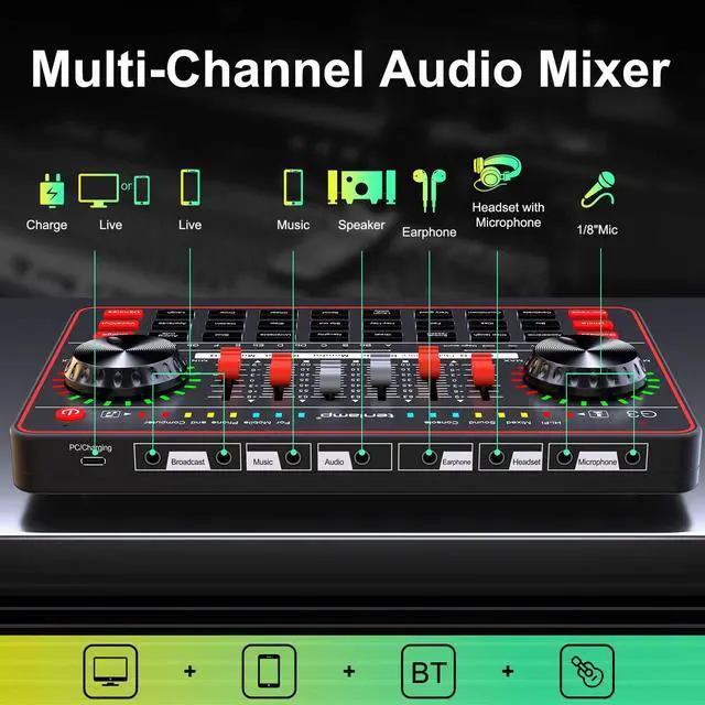 Audio Mixer, Sound Board for Pc/Phone Live Streaming Singing Gaming, Sound Mixer for 3.5mm Microphone, Xlr Interface with DJ Mixer Effects & Voice Changer, Denoise, Bluetooth Podcast Mixer