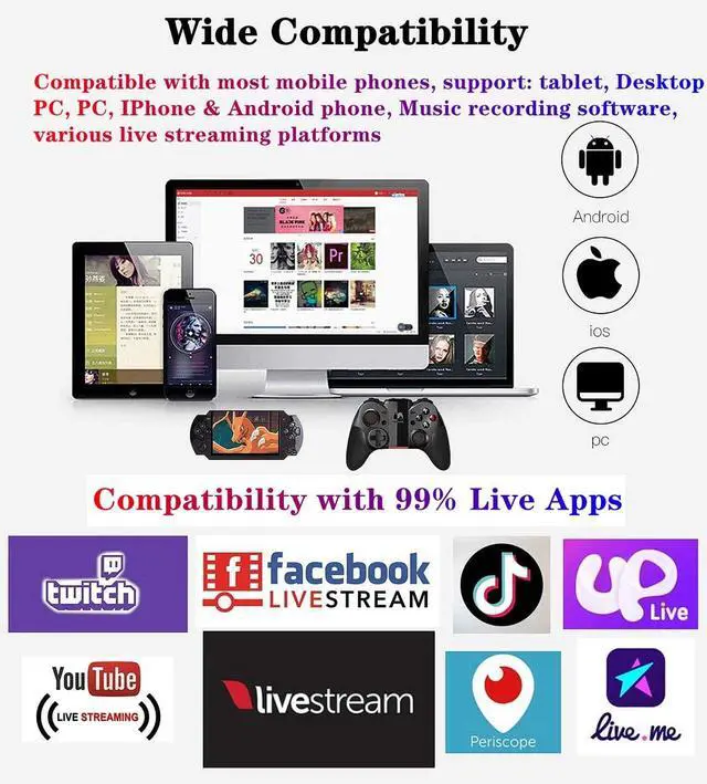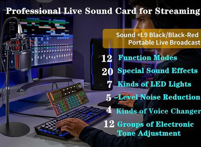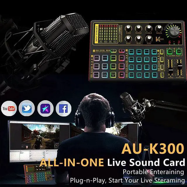 K300 Live Sound Card with Sound Effects and Voice Changer for Live Streaming The K300 sound borad can be used for live streaming, podcast, broadcast, music recording, gaming live streaming, radio shows, Twitch, TikTok and YouTube streaming, this is also a voice changer for gamer who play games online. Built-in a DSP digital audio processor, can switch multiple scene modes arbitrarily and supports dual microphones , dua live broadcast, dual headphones. The K300 sound board is a live sound card that is not difficult to use, even beginners can quickly get started. It also is a feature-rich and professional audio digital signal processor, which incorporates microphone interfaces, audio mixer, sampler, and entertaining pitch changer. Built-in a DSP digital audio processor, can switch multiple scene modes arbitrarily and supports dual microphones , dua live broadcast, dual headphones. It is easy to use, Plug and Play, and focus on helping providing valued and interesting content and easilly interacting with your audiences. A great CHRISTMAS GIFT OR BIRTHDAY GIFT for those who love podcast or singing. ALL-IN-ONE Live Sound Card for Live Streaming 8 Knobs: Independently adjust the microphone equalization(treble/mezzo/bass), microphone volume, voice changer volume, monitor volume, dodge speed.1 large knobs adjust reverb effect. 4 Reverb Modes: You can freely choose 5 preset reverberation modes, no cycle through, just 1 key to start: KTV, Concert, Studio, MC. 4 Voice Changer: One-key to change multiple role voices to increase fun, Male/Female/Children/Warcraft voice 20 Atmosphere Special Effects: There are 20 atmosphere special effects for you to choose from, such as Laughter, Kiss, Debut. 2 Track Control: Independently adjust the volume of the accompaniment music, record volume. Strong Compatible: The K300 live sound card voice changer machine can be compatible with PC, Computer, iPhone, iPad, Tablet, Android phone, Type C phone, gaming devices and electronic musical instrument. A great CHRISTMAS GIFT OR BIRTHDAY GIFT for those who love podcast or singing. Multi-Device Support: Compatible for three cell phone live, mobile phone computer synchronous live, one computer live, computer accompaniment cell phone live, instrument input cell phone live. Support two microphones connected at the same time, highpitch, alto-voice and lowpitch can be adjusted independently. It's great to support Android Apple devices, mobile phones, computers, PS4, and other games to change your voice. Multiple Sound Effects and Voice Change 16 kinds of warming up sound effects : Applause, Laughter, Lightning, Proud, Debut, 666, Face slap, Kiss, Don't laugh, Great, Strong, Pretty boy, Ouch, Too hard, Brother, Fllow. 4 kinds of Voice changer: Short press to change voice modes to female voice, male voice, Child voice, monster voice, etc. 12 kinds of electricity sound. LED Luminous Button Cool Lighting Effect This live sound card is equipped with seven different colors of breathing lights. The colorful lights, changing with the music, have the same atmos