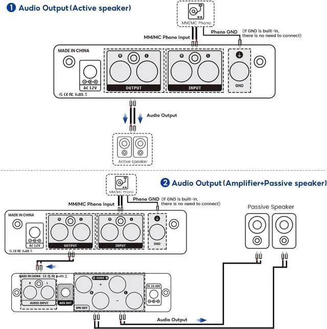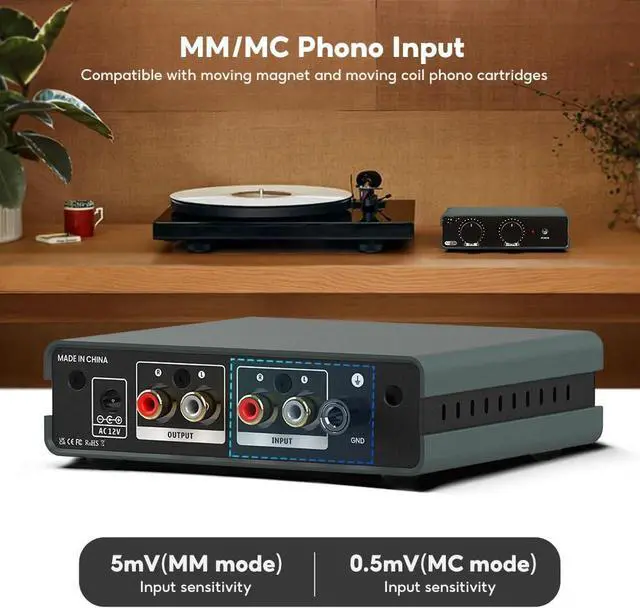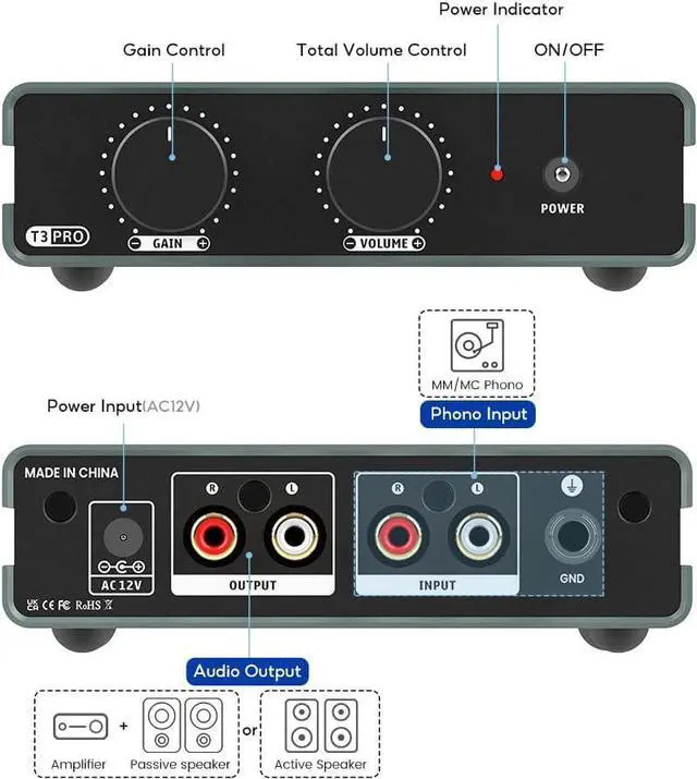 Professional Phono PreampThe T3 PRO MM phono preamp supports MM/MC cartridge inputs only (no other audio inputs). Its RCA outputs connect directly to powered speakers or home audio amplifiers.
