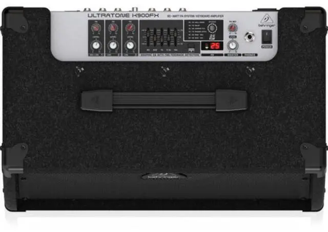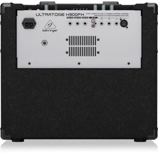 Behringer Ultratone K900FX is a 3-channel, 90-watt keyboard amplifier and small PA in a rugged bass-reflex enclosure, housing a 12" woofer and a custom 1" horn-loaded tweeter. It features built-in 24-bit digital effects processing with 100 presets, feedback detection and suppression circuitry, a master 5-band graphic EQ, three 1/4" line inputs, a stereo RCA input, and an XLR input for dynamic microphones.