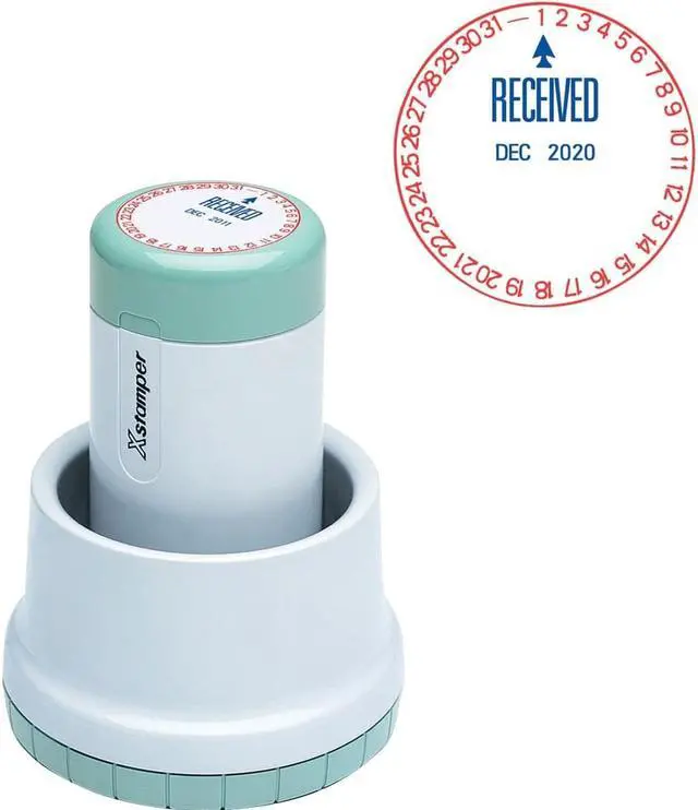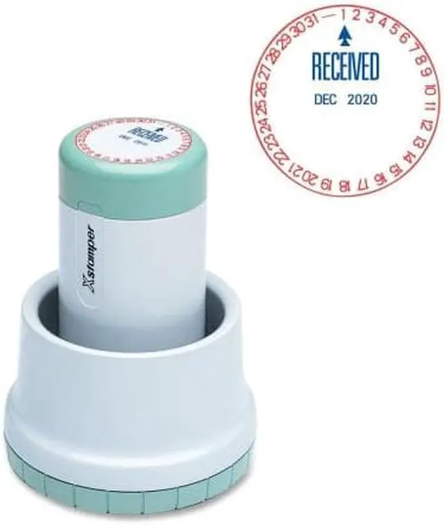 XpeDater rotary two-color stamp is ideal for keeping track of paperwork. The date on the six-year band changes easily by turning the dial inside of the stamp. Change the day by twisting the outer dial ring. RECEIVED and date print in blue. Stamp prints red "day" on outer ring. Included handy pre-inked base keeps ink on the stamp and not on your desk. Impression size is 1-3/16" diameter.