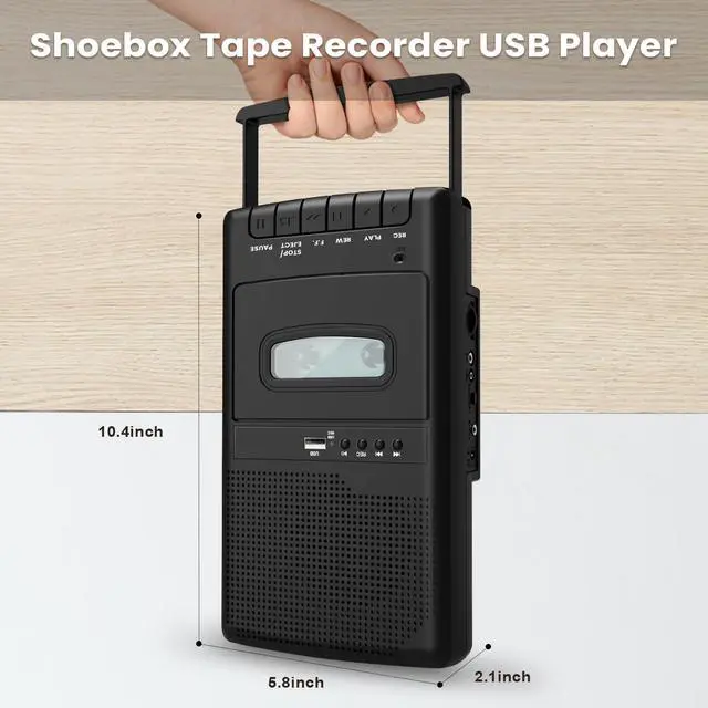 The shoebox tape player is equipped with a retractable carrying handle at the top. The product measures 10.3" x 5.7" x 2.0", a compact size for easy portability.