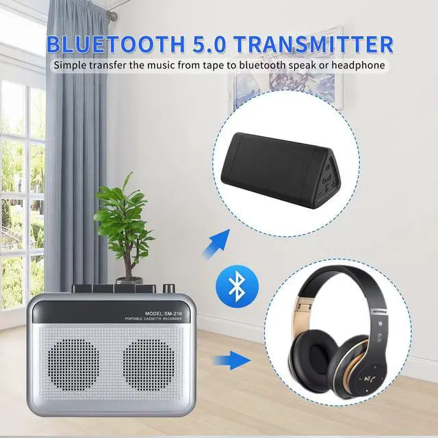 With an advanced Bluetooth 5.0 chip, this bluetooth cassette player provides fast pairing and stable sound. Just turn on the Bluetooth function, you can quick transmit cassette audio to Bluetooth speakers/headphones wirelessly and start listening to your treasured tapes.