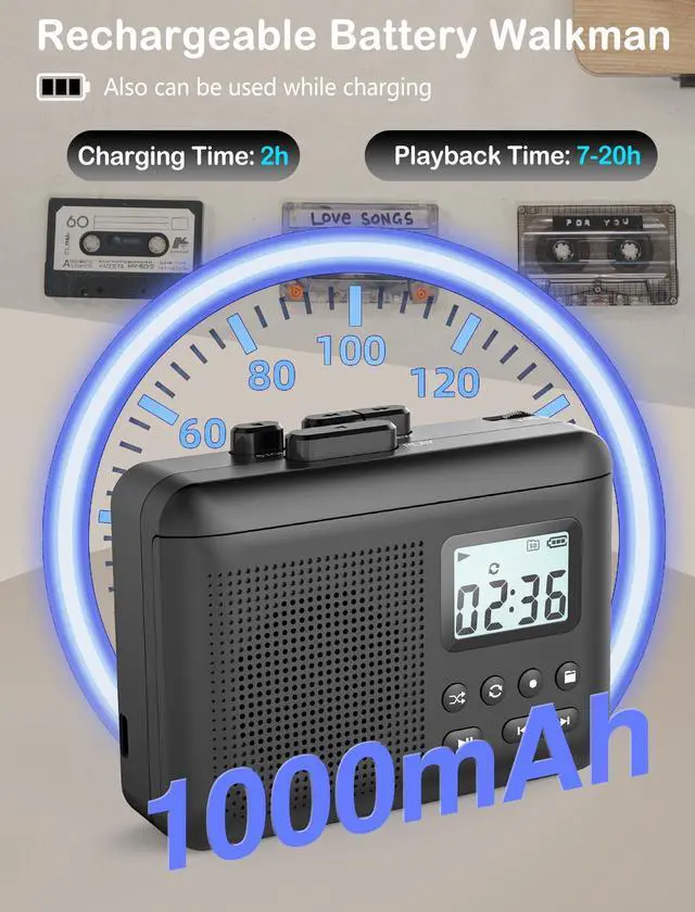 - [High Quilty Sound & 3.5mm Earphone]This cassette player converter built-in 3W speaker with crystal clear and lossless playback. Easily fill the entire room with music. This means you can enjoy the high sound quality and even play your precious old cassette clearly. Besides,if you want better sound than the tape itself, the portable cassette player also has a 3.5mm earphone jack. Insert earphones to enjoy your private time and let the tape player take you back to the old times.