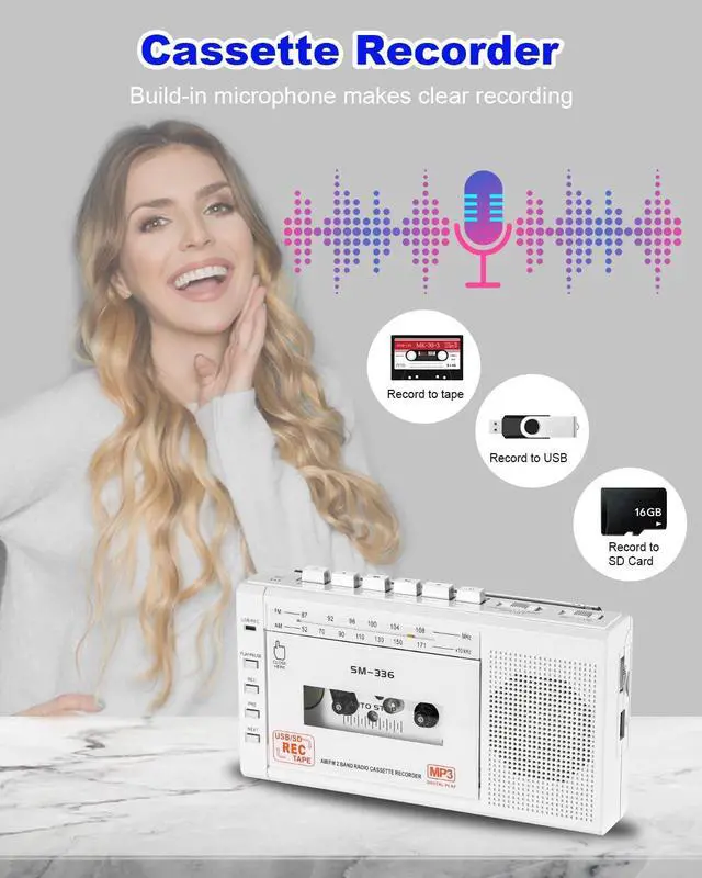 Equipped with built-in HD microphones, this cassette tape player allows for high-quality recording to tape or USB flash disk or Micro SD card.