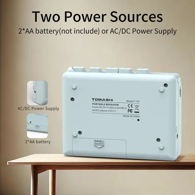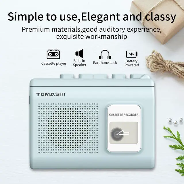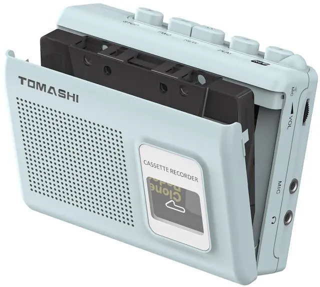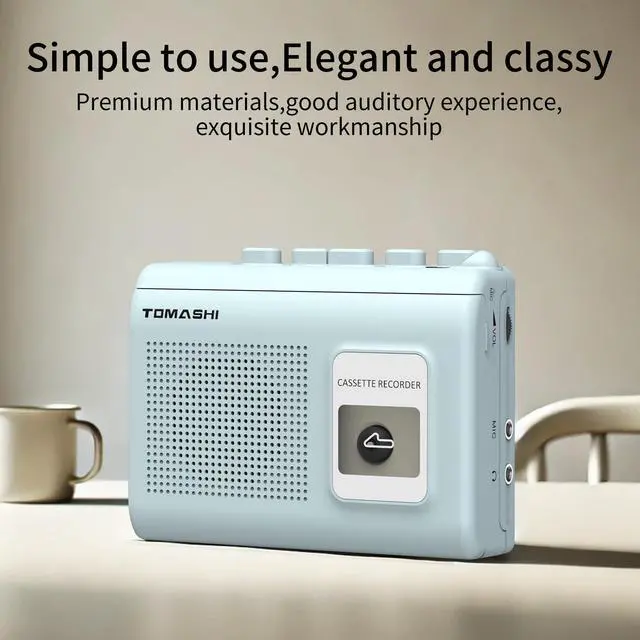 This device features cassette play and record functions, a built-in microphone, a microphone jack, an earphone jack, and an AC/DC adaptor jack. It operates on two AA batteries and has a compact size of 120mm (L) × 38mm (W) × 87mm (H), weighing just 0.33 pounds.