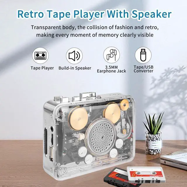 Portable Clear Stereo Auto Reverse Cassette PlayerConvert Tapes to MP3 Format via USB ConverterBuilt-in Cool Copper Wheel Movement Speaker