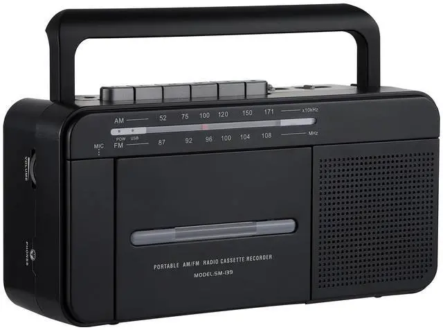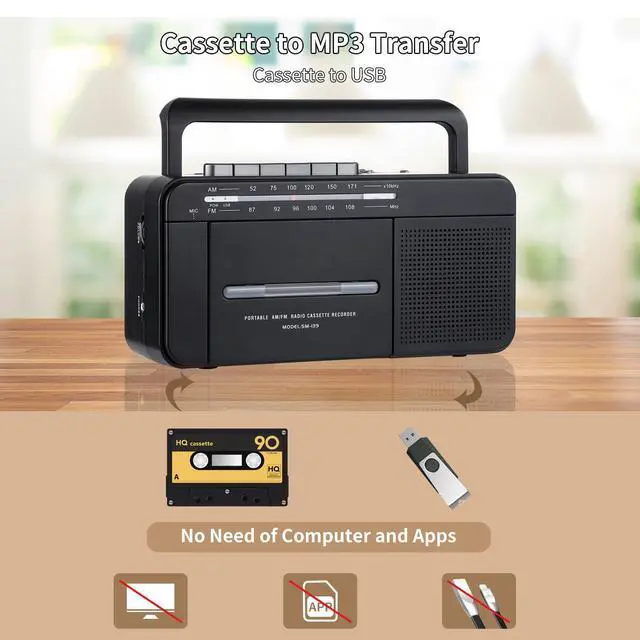 This AM/FM radio cassette player boombox has excellent tape performance and can convert cassette audio to digital MP3 files via USB. An attached swivel handle, a large easy-reading scale, simple tuning knobs, and a big speaker for stereo sound make this cassette radio boombox perfect for indoor, outdoor, car, walking, travel, camping, etc.
