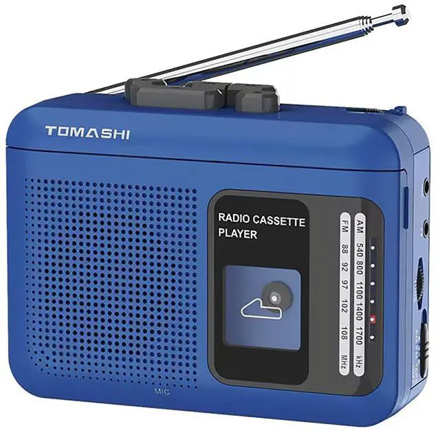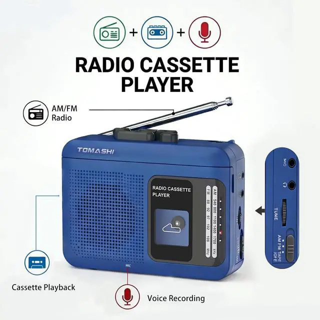 Play/record cassette tapes (blank tapes not included), AM/FM radio (540-1700kHz/86-108MHz) with telescopic antenna, and AUX line-in recording via built-in mic or external devices.