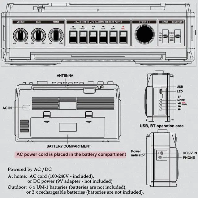 This vintage style boombox is versatile. you can record radio, Bluetooth audio, USB audio or voice directly to blank cassette.(Please note: Transfers maintain original audio quality without enhancement and may introduce slight distortion.)