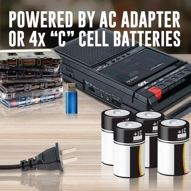 This bluetooth cassette tape recorder with FM radio, housed in a shoebox design. Stream music, record cassette tapes, and create voice memos with its built-in microphone. Additionally, it supports playing music from USB drives and can be powered by an AC or 4 "C" cell batteries (not included).