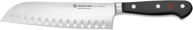 The newly updated Wusthof Classic Hollow Ground Santoku is a versatile, all-purpose blade that is prized for the precise way in which it cuts. The deep blade glides through foods and holds a straight line as it chops and slices through vegetables and raw or cooked boneless proteins. The Granton edge design enhances performance by creating air pockets that reduce drag and water adhesion, so slices are cleaner and less food sticks to the blade. Wusthof's Hollow Ground Santoku is unique to the Classic series because the blade is ground thinner, and the edge is created with a scant 10° bevel per side. This makes for a very fine, razor-sharp edge. The cutting performance is perfectly suited to most fruit, vegetable, and boneless protein prep, but care should be taken with hard winter squashes and the blade is not recommended for cutting frozen foods or bones. The new Classic Series features the updated Trident logo inlayed on every handle and etched on every blade. Hand washing is highly recommended. Made in Solingen, Germany and backed by Wusthof's lifetime warranty.