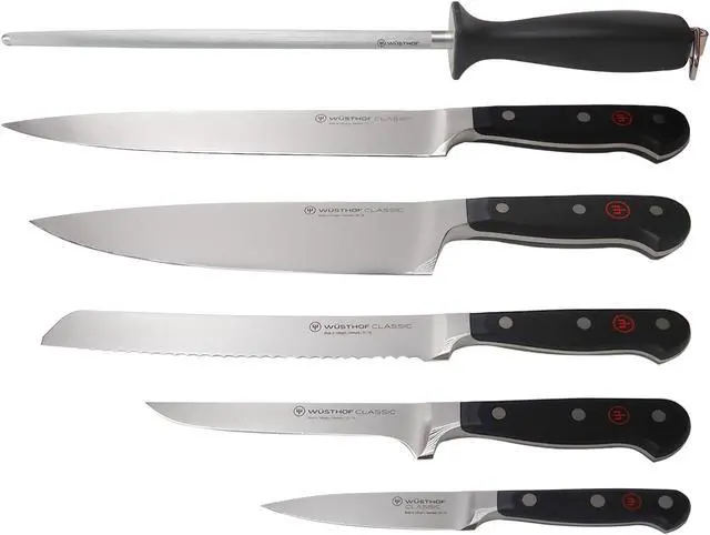 Wusthof 1120160602 Classic Six Piece Cook's Set 6, Black 6 Piece Chef's Knife Set with full tang triple riveted synthetic polypropylene handles that resist fading, discoloration, heat and impact. The WÜSTHOF Classic Series has been our best-selling series.