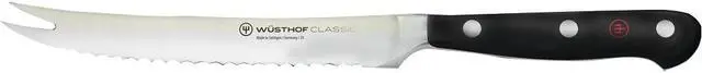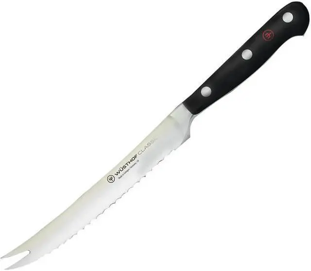 Wusthof Classic 5" Tomato KnifeThe Wusthof Classic 5-inch Tomato Knife is the perfect tool for slicing delicate or soft foods that require an incredibly sharp, serrated blade. At 5 inches long, the Classic Tomato Knife is much easier to use than your larger bread knife, and it still excels at cleanly slicing through other foods like baguettes and Kaiser rolls or peeling limes and lemons.
