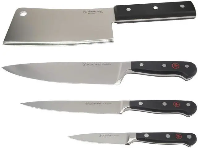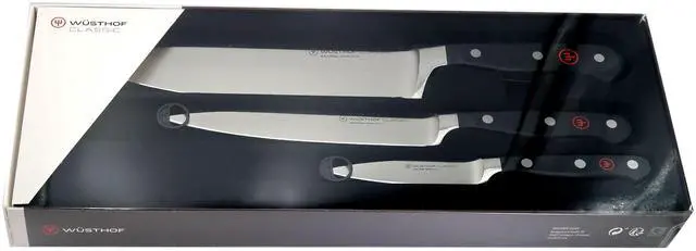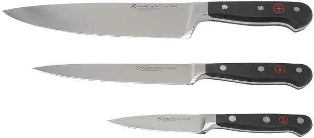 WUSTHOF CLASSIC 3-PIECE CHEF'S KNIFE SET #1120160301 + WUSTHOF CLASSIC 6" CLEAVER KNIVE, BLACKWusthof Classic 3-Piece Chef's Knife SetA perfect starter set for home cooks or professional chefs. This three-piece Chef's knife set includes one Classic 3 1/2" Paring Knife, one Classic 6" Utility Knife, and one Classic 8" Chef's Knife.