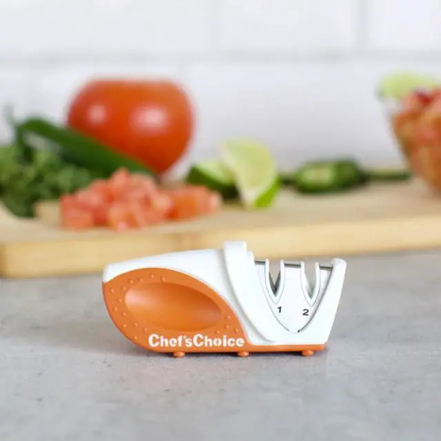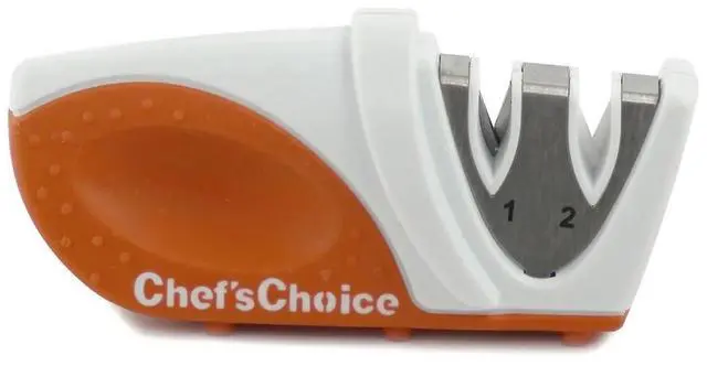 The Chef'sChoice Model D4760 Compact 2-Stage Manual Knife Sharpener is designed to put a factory-sharp, precise edge on your straight, serrated, cleaver and sports knives. This compact manual knife sharpener has two stages that sharpen to perfection. The first stage hones each side of the edge with fine 100-percent diamond abrasives. The second stage polishes the edge using ultra-fine 100-percent diamond abrasives. It is Dizor Engineered with double bevel facets set at different angles that form a supportive double-bevel, arch-shape edge. This manual knife sharpener is proudly made in the USA.