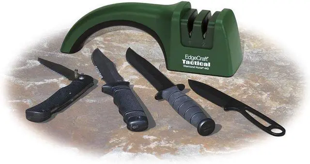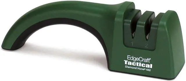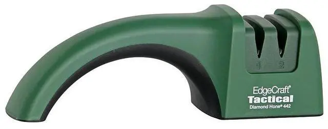 All Edge Craft pencil sharpener use 100% diamond sharpener, the hardest known material. This grinds any metal alloy faster, more efficiently and never ruins the temper of your edges. The diamonds keep the grinding surface cooler than other materials so as not to damage the blade, only sharpening. The manual cascading design of the 442 grinds the edge and then spares it into a razor-sharp polisher. This 4420300 has been specially developed for the wider geometry of tactical knives.