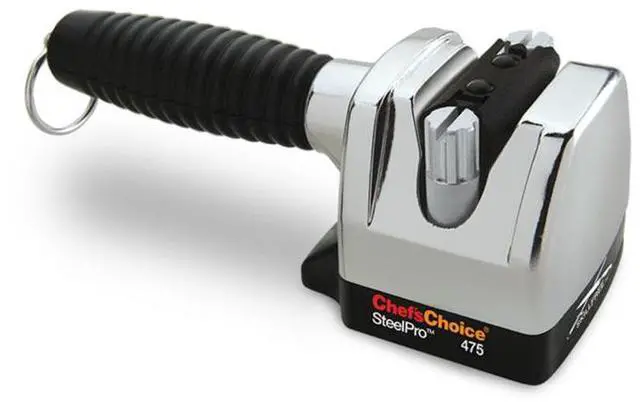 This SteelPro manual knife sharpener from Chef'sChoice? is a heavy duty, rugged cast metal unit geared towards the commercial food industry. It features super-hardened miniature steels and highly precise angle guides that deliver an edge far superior to conventional manually steeled edges. The super-hardened, non-abrasive miniature steels develop uniform ultra-sharp microscopic serrations along the entire edge of the blade. Steeling consistently at a precise angle, this SteelPro sharpener does not round off the knife edge as conventional steels do - it maintains the original sharp edge geometry and creates uniform microscopic serrations that work together for a better cutting edge.
