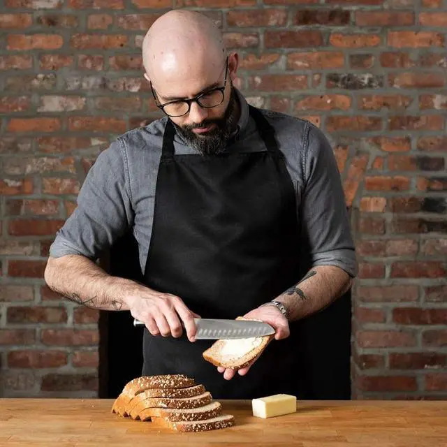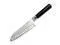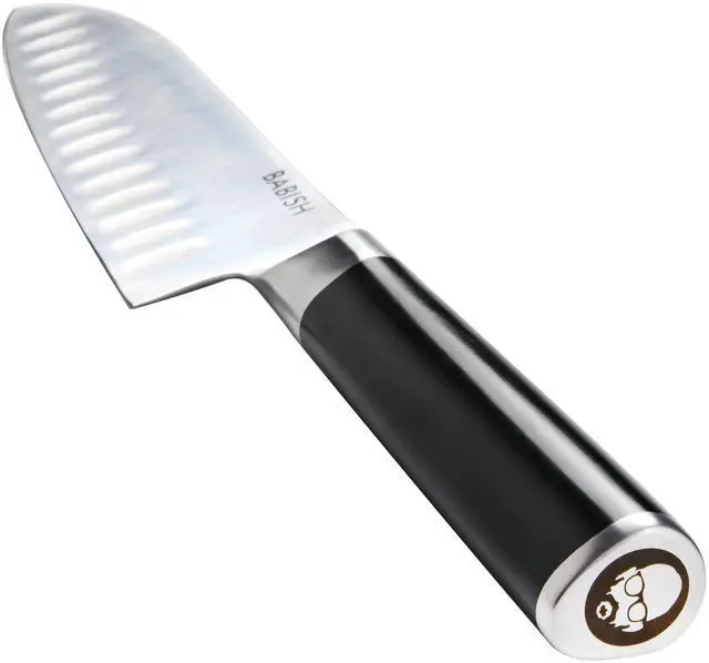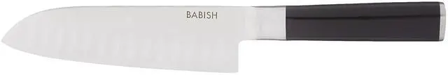 This santoku knife is precision-forged form a single piece of high-carbon German Steel, then heat tempered and hand-ground for maximum sharpness. The straight, slender blade is designed to easily slice through tough foods and has just the right amount of rock for chopping herbs or mincing onions. A full-tang handle provides a balanced, comfortable grip, and an etched Babish logo on the butt caps things off nicely. It's a kitchen workhorse that'll have you galloping through piles of veggies and tough cuts of meat.
