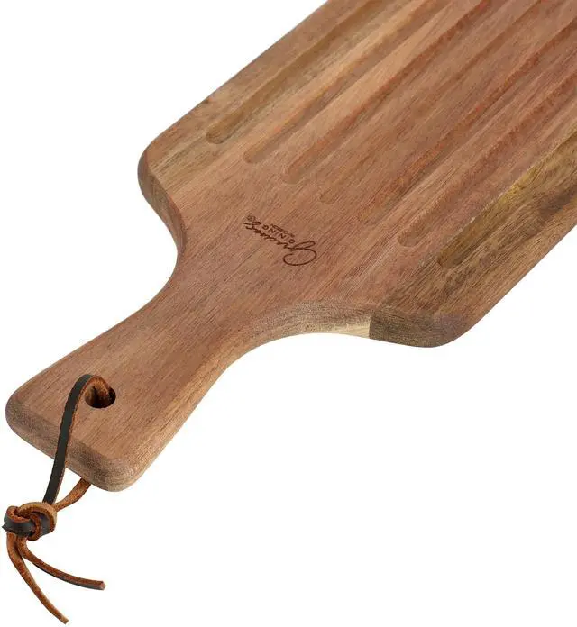 Serve up your favorite fresh breads with this serving board and bread knife set. This visually stunning arrangement is perfect for grazing and gatherings, staged on a solid wood board as a nod to artisanal craftsmanship. Long 20.3 x 5.5 in board features a handle for easy transport and a hanging loop for storage options. Seven slicing grooves adorn this serving board, making it easy to cut your breads into perfectly even pieces and serve all in one place. Stainless steel partial tang bread knife is constructed of stainless steel and a double riveted wooden handle for style and quality.