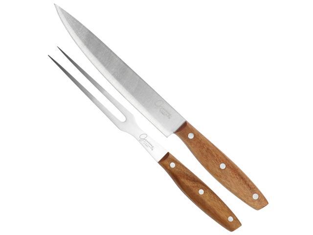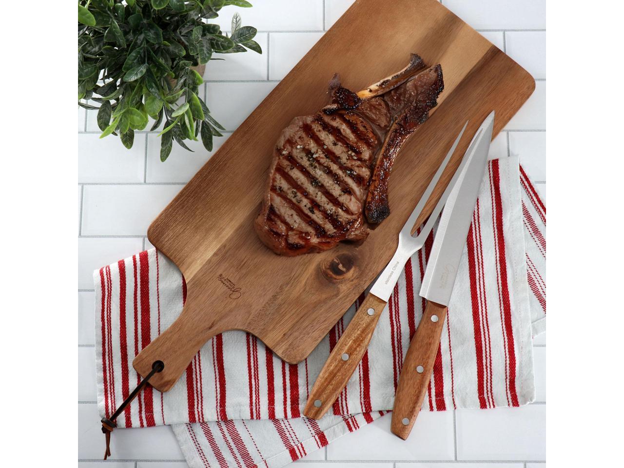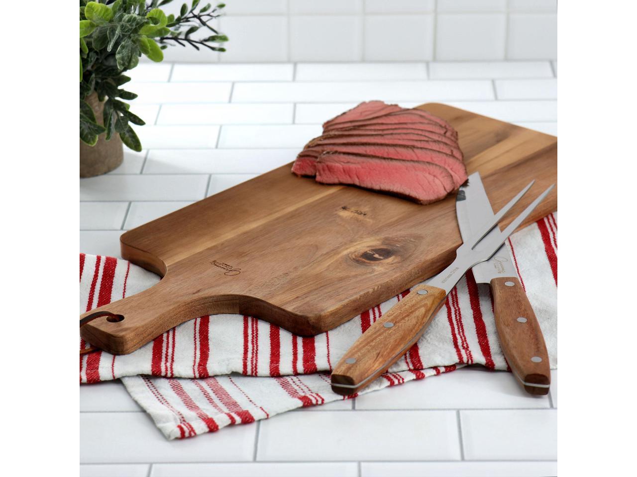 - Set includes: One serving and cutting board, one carving fork, and one carving knife