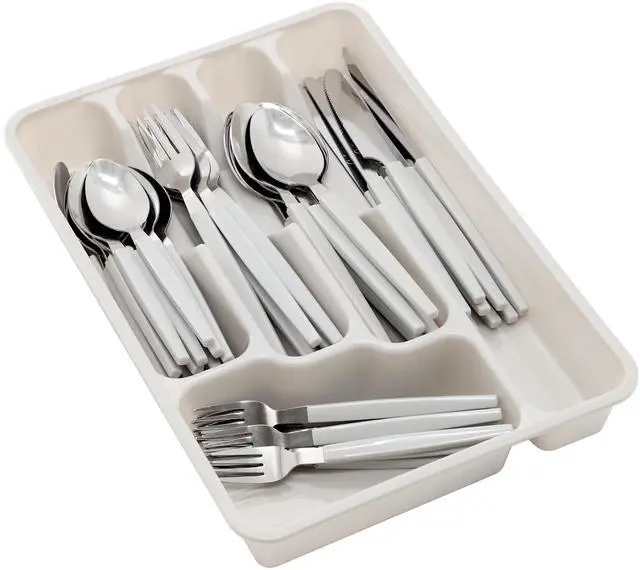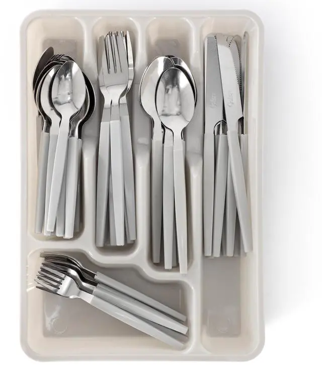 To keep everything neatly organized, the set comes with a plastic tray featuring five separate compartments for easy storage. The tray ensures your flatware stays in place and is easily accessible. Designed for convenience, the entire set is dishwasher safe, making cleanup a breeze. Whether you're hosting guests or simply enjoying a meal at home, the Gibson Home Edzelle Flatware Set combines style, functionality, and practicality to elevate your dining experience.