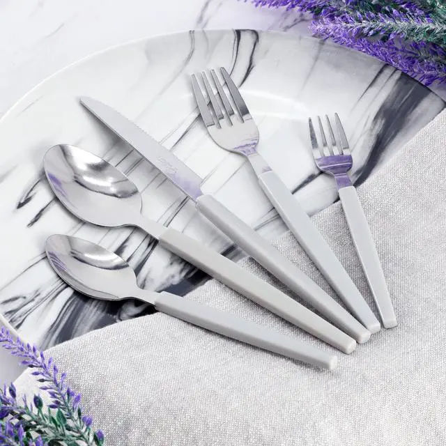 The Gibson Home Edzelle 48-Piece Stainless Steel Flatware Set in Gray with Plastic Tray offers a sleek and modern design perfect for any dining occasion. Crafted from durable stainless steel, each piece ensures long-lasting quality while the square-shaped plastic handles add a contemporary touch. The cool gray color of the handles complements a variety of table settings, bringing a refined and stylish look to your dinner table. This set includes a comprehensive range of utensils, from dinner forks to teaspoons, making it an ideal choice for families, dinner parties, or everyday use.