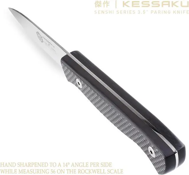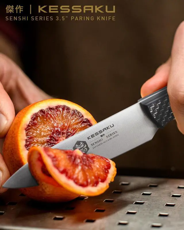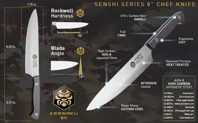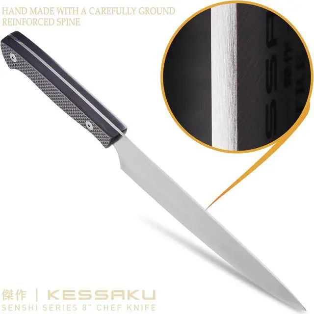 Astonishingly formidable with unparalleled craftsmanship, our Senshi Series knives were crafted to reflect centuries of traditional Japanese knife design, along with cutting-edge forging techniques. Stylish and gorgeous, these knives will draw the eye in any kitchen! Ferociously sharp, made from Japanese AUS-8 Stainless Steel for greatly enhanced corrosion and rust resistance. It's Precision Forged, Nitrogen Cooled blade is individually handcrafted and hand-sharpened by our technicians in the traditional Japanese 3-stage Honbazuke method to 14° per side for clean, precise, cuts, amazing edge-retention, with a Rockwell Hardness of 56 for maximum strength, flexibility and blade edge durability. Our military grade Carbon Fiber G10 Fiber-Resin hybrid handle is impact-resistant, and nearly impervious to heat, cold, and moisture, while its seamless build ensures no debris can ever infiltrate its body. Ergonomically designed with ample knuckle clearance for superior control and agility, triple-rivet construction, and Full Tang Strength for a lifetime of safe and precise use.