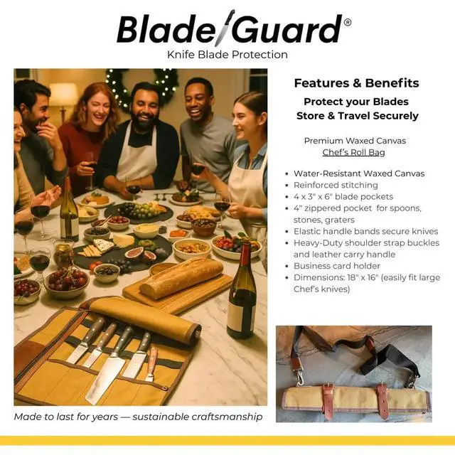 The Blade Guard Waxed Canvas Knife Roll Bag combines rugged, water-resistant canvas with reinforced stitching to protect and organize essential kitchen tools. Four dedicated knife pockets hold chef, utility, boning and paring knives, while a full-width zippered pocket stores spoons, peelers, stones and other accessories.