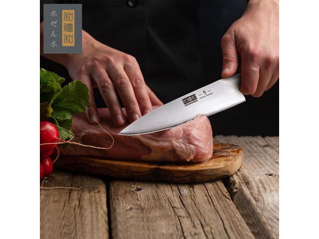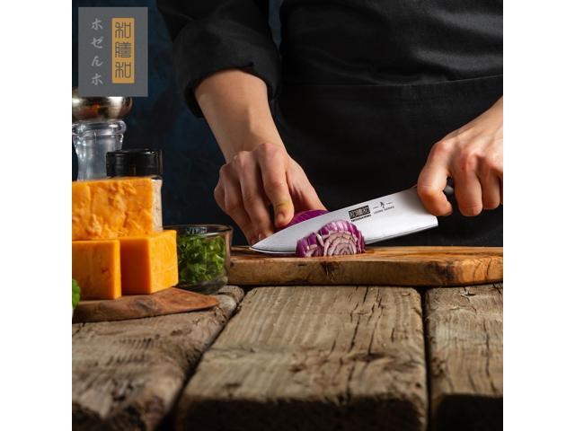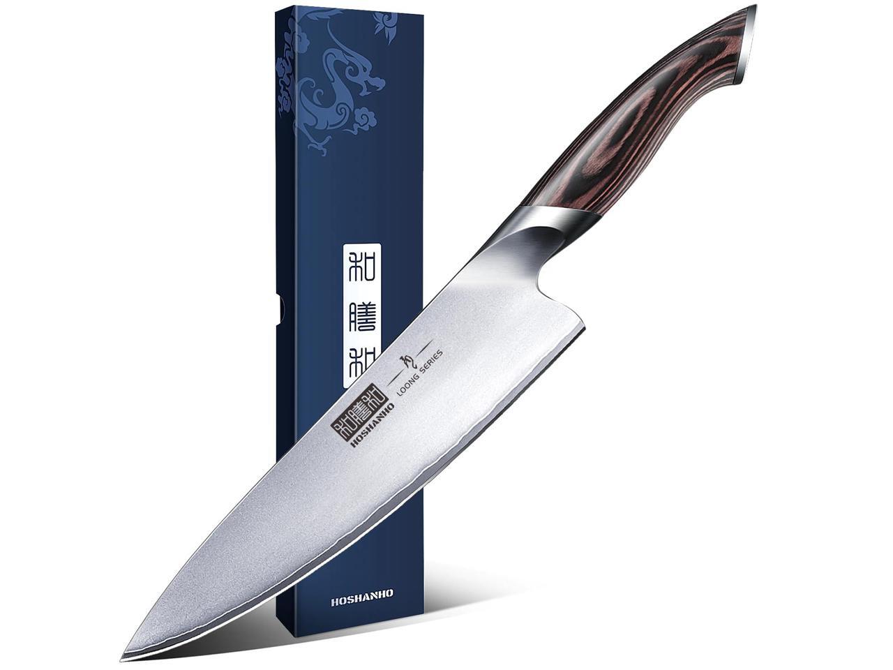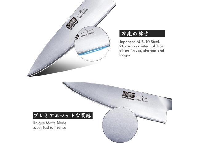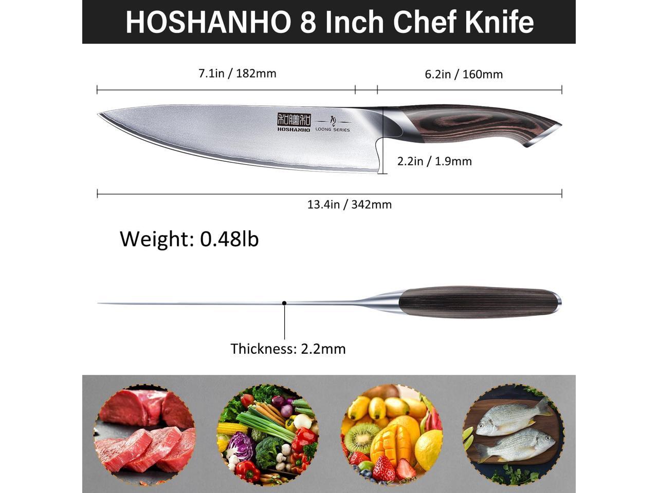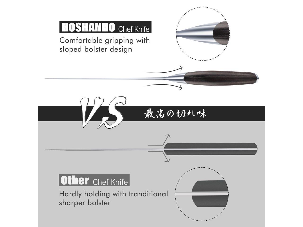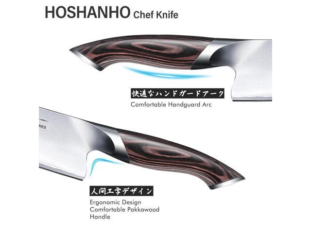 - High-End Japanese Steel Chef's Knife HOSHANHO chef's knife is made of high-end Japanese steel AUS-10, 2x of the sharpness and durability of some other premium knives, and it owns a very high cost performance! With a hardness of up to 60 HRC, the kitchen knife offers excellent rust resistance, sharpness and durability.