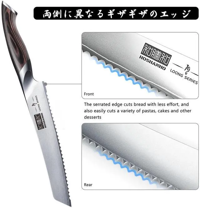 Ultra Sharp Serrated Edge Precision hand-sharpened 15° serrated blade effortlessly cuts all types of bread from crusty baguettes to soft toast, delivering even slices without crumbling.
