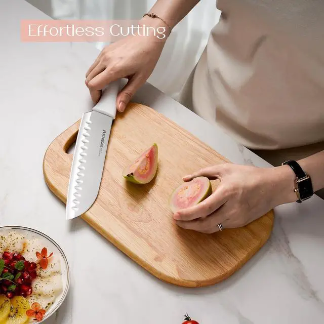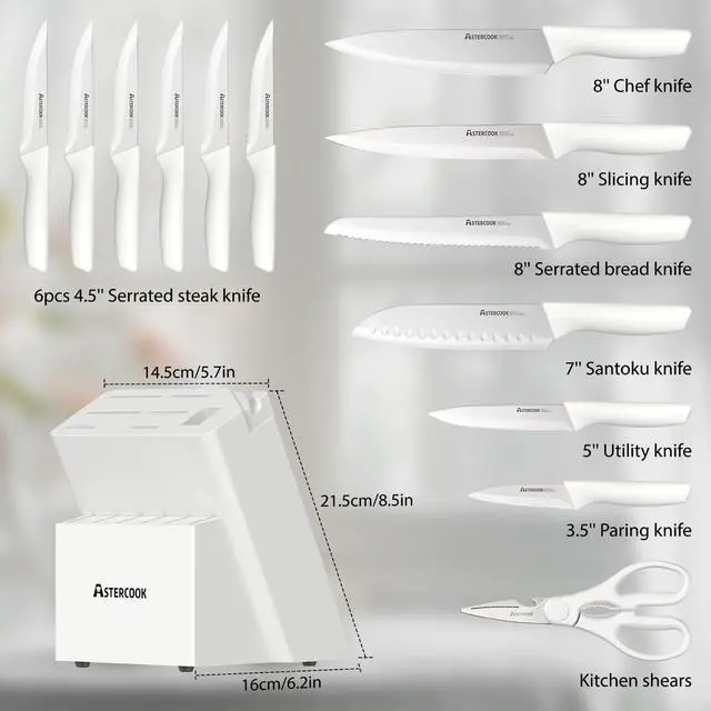 | Included Components | 3.5" Paring knife, 1 Pcs kitchen shears, 6 Pcs 4.5" serrated steak knife, 7" Santoku knife, 5" Utility knife, 8" Chef knife, 8" Slicing knife, 8" Serrated bread knife, Sharpener and Block |