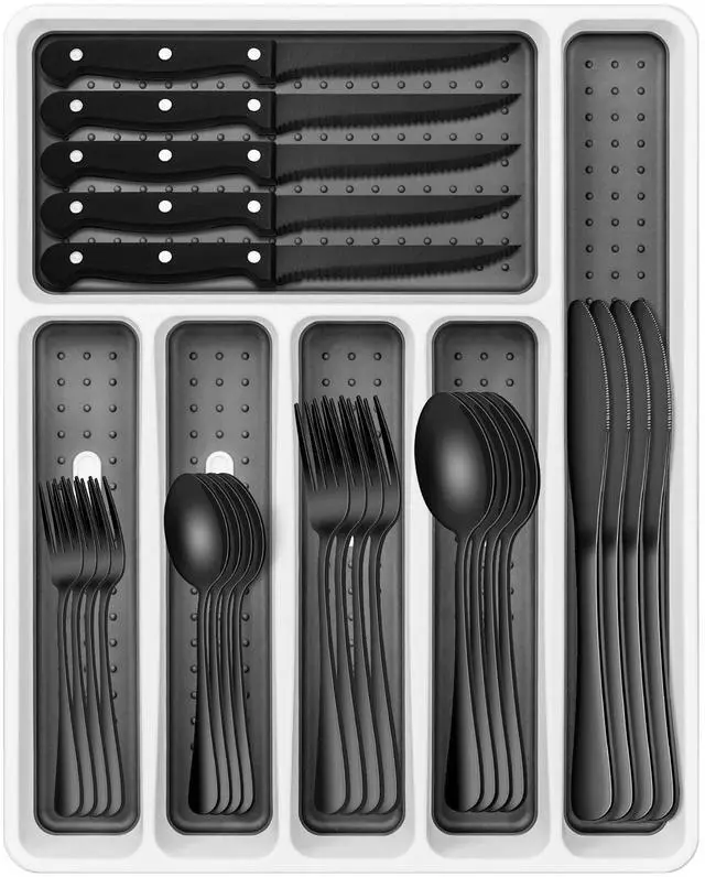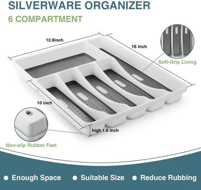 Each organizer featured non-slip rubber feet pements cutlery organizer from moving. Soft-grip lining fixes the tableware in the cutlery tray. The cutlery drawer organizer with 6 compartments, provide enough space for various sized kitchen gadgets