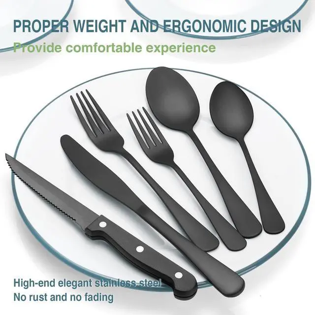 This premium stainless steel flatware set are made of the black stainless steel will not bend, break, or get damaged by heat. Sturdy enough for basic daily use, rust resistant and durable for years to come