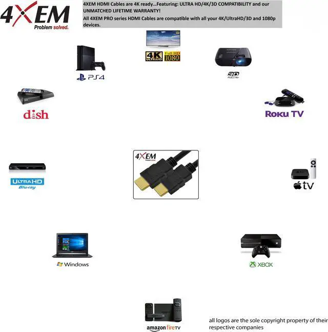 The 4XEM ultra High speed and quality Pro Series HDMI cable fully supports 3D Ethernet1080p as well as 4K2K resolutions with 120Hz refresh rate and real life like color. Our professional series HDMI cables accommodate the current and future demands of high definition displays. They feature 2 gold plated HDMI male connectors with high quality construction. Connect your Blu-Ray player gaming systems and all HDMI compatible devices to your HDTV for flawless dependability.