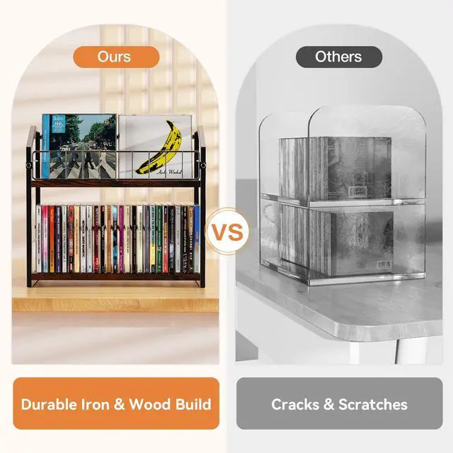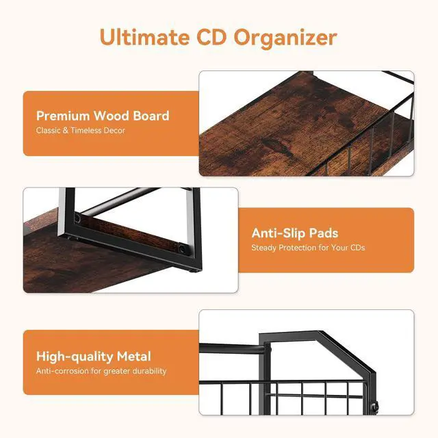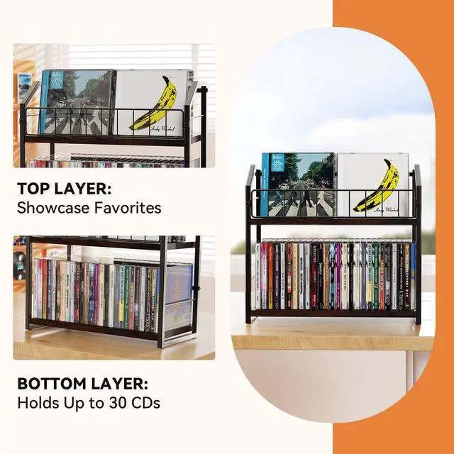 This versatile 2-tier CD organizer masterfully combines high-capacity storage with elegant design. Its intelligent structure features a lower tier that holds up to 30 standard CD cases, while the upper tier horizontally displays up to 26 CD covers for optimal visibility and quick access. Crafted from a durable blend of robust carbon steel and high-quality vintage wood, this rack offers industrial strength that complements any modern or retro interior. The upgraded design includes guard rails on the second tier to securely hold everything from spice bottles and syrup jars to coffee mugs, effectively preventing slips. Compact yet sturdy, it's perfect for desktops in home offices, kitchens, living rooms, and entertainment areas, providing a durable and stylish solution for your growing collection.