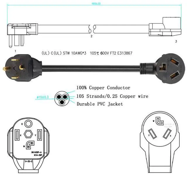 NEMA 14-30P 4-prong plug 125V/250V molded male. NEMA 10-30R 3-prong socket 250V molded female connector. Both are right angle, 30 AMP, Max wattage 7500 watts.
