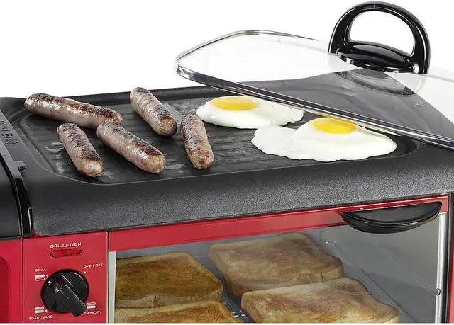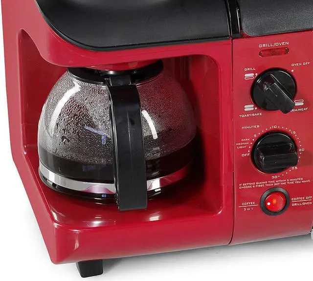Bring the family together and make a complete breakfast with just one appliance. Enjoy a cup of Coffee with the four-cup Coffee maker, then treat the family to a variety of breakfast meats and eggs cooked on the large, non-stick griddle. The multi-functioning toaster holds up to four slices of bread at a time, and is perfect for 7-inch frozen pizzas, hot sandwiches, desserts and more. For added safety, A 30-minute timer is included with automatic shut off. When the meal is done, the griddle and oven tray remove for easy cleanup.
