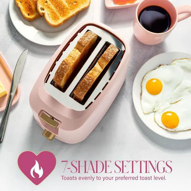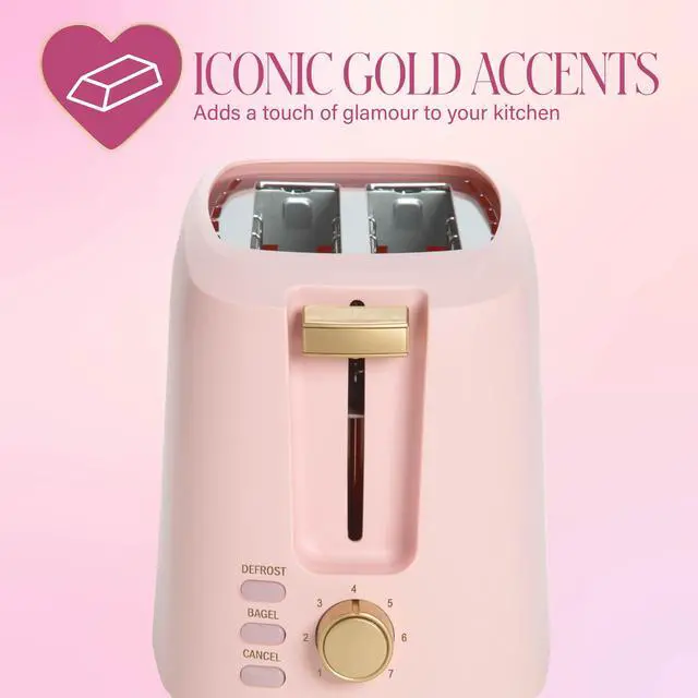 Start your mornings in style with the Paris Hilton 2-Slice Toaster a kitchen essential thats as fabulous as it is functional. Designed with Pariss signature mix of glam and practicality, this toaster makes every slice of bread or bagel feel like a breakfast upgrade. With soft blush tones and luxe gold accents, its more than just an applianceits a countertop accessory youll actually want to show off. Seven customizable browning levels put you in total control, so your toast comes out exactly the way you like itwhether youre a fan of lightly golden or extra crispy. The extra-wide slots are made for real life, fitting everything from rustic bakery loaf slices to thick bagels with ease. For mornings when youre in a rush, the defrost function quickly revives frozen waffles or bread so they taste bakery-fresh again. Love bagels? The bagel function gently toasts the cut side while warming the outer edge, so you get that perfect crunch without overdoing it. Cleaning is just as effortless as cooking. A removable crumb tray slides out for quick, easy cleanup, keeping your kitchen as fresh as your toast. No mess, no stressjust a polished look that makes you say, Loves it. The Paris Hilton 2-Slice Toaster combines chic design with smart features, proving you dont have to sacrifice style for function. Whether youre making avocado toast before a busy day or heating up a bagel for brunch, this toaster brings a little extra sparkle to your everyday routine. Thats hot.