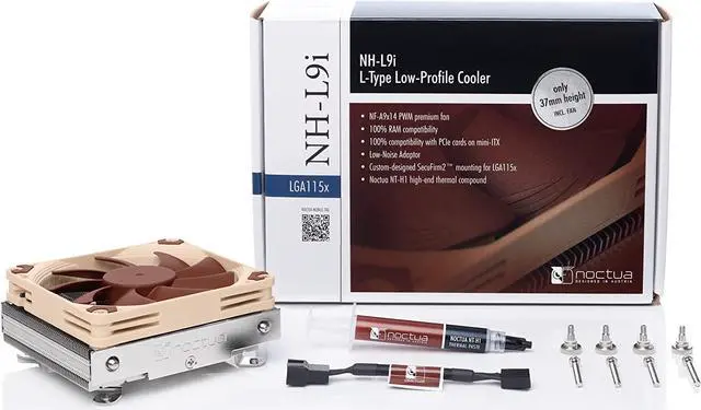 The NH-L9i is a premium quality quiet CPU cooler for Intel LGA115x/1200 based HTPCs and Small Form Factor systems. At a super-low profile of only 37mm, the NH-L9i is ideal for extremely slim cases and due to its 95x95mm footprint, it provides full compatibility with tall RAM modules and VGA cards on mini-ITX mainboards. The custom designed SecuFirm2 mounting system for LGA115x/1200 makes installation a childs play and thanks to the highly optimised NF-A9x14 premium fan that supports fully automatic speed control via PWM, the NH-L9i runs remarkably quiet. Topped off with Noctuas renowned NT-H1 thermal compound, the NH-L9i fuses everything users have come to expect from Noctuas larger coolers into a super-compact package for slim HTPC systems.