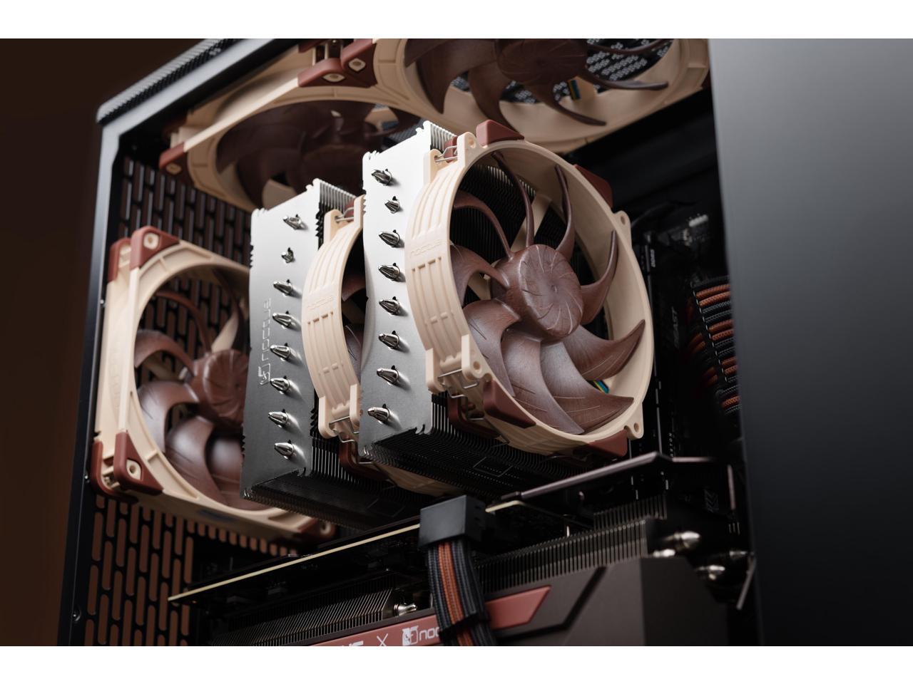 - Two state-of-the-art NF-A14x25r G2 140mm fans with speed-offset for acoustic fine-tuning, Low-Noise Adaptors and PWM for automatic speed control: maximum efficiency under load, near silent at idle!