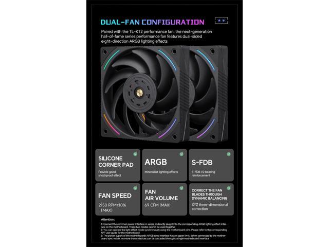 - High airflow TL-K12 PWM ARGB fans; two 120 x 120 x 25 mm PWM fans deliver up to 2150 RPM, 69 CFM airflow and 2.87 mm H2O air pressure with about 27 dBA noise level and S-FDB V2 bearing