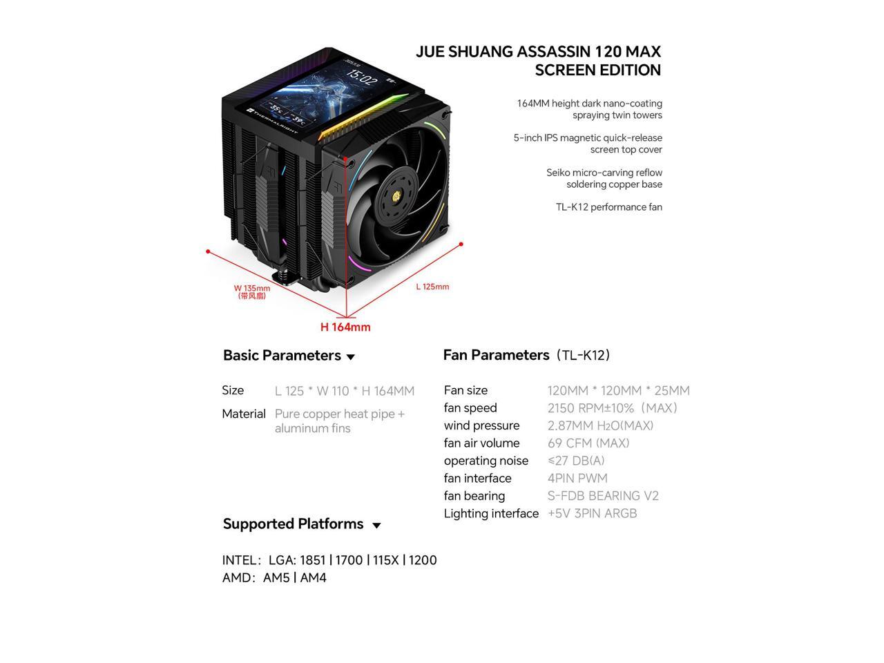 Thermalright Peerless Assassin 120 Vision MAX ARGB CPU Cooler, 5 Inch LCD, TL-K12 2150RPM 120mm Fans, for AMD AM4/AM5, Intel 1851/1700