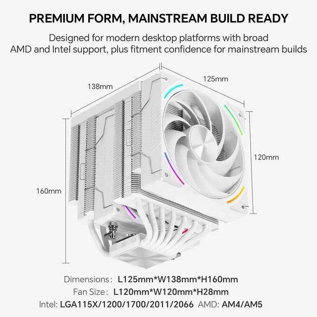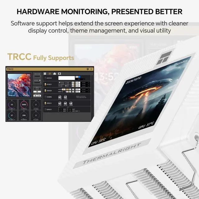 Thermalright Phantom Spirit 120 Vision EVO is a high-performance dual-tower CPU cooler designed for users who want strong air cooling and a more advanced display experience in one design. It features a 3.95-inch IPS LCD screen with 480x480 resolution and magnetic installation for a cleaner, more flexible visual upgrade. Built for demanding desktop workloads, it uses 7x6mm AGHP GEN 5.0 heat pipes, a micro-engraved reflow-soldered C1100 pure copper nickel-plated base, and a 160mm dual-tower heatsink for efficient heat transfer. The TL-K12-X28-R9 120mm PWM fan uses LCP blades and an anti-vibration balanced noise-reduction ring to deliver up to 92CFM airflow and 3.0mmH2O air pressure. With TRCC software, users can monitor system information, customize display content, set personalized text, use dynamic cloud themes, and manage display functions more freely. The cooler supports Intel LGA115X/1200/1700/1851 and AMD AM4/AM5 platforms, and is backed by a 3-year manufacturer warranty. Technical Spec: TL-K12-X28-R9 FAN Spec: Intel: LGA115X/1200/1700/1851 Software Notes: *All data above comes from the Thermalright laboratory and is for reference only.