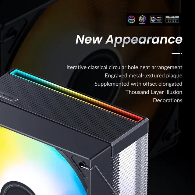 JONSBO CB40 Black CPU Cooler features architecture with ARGB FAN- Mute Series air cooling technology. The top cover features a classic round hole pattern arranged neatly, with a metal-textured nameplate embedded and offset long strip-infinity mirror accents, creating a simple yet appropriately 3D lighting effect.