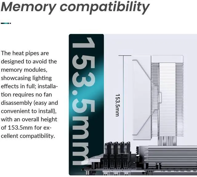 Compact Dimensions: CPU cooler height of 153.5mm ensures compatibility with most PC cases while maintaining cooling efficiency.