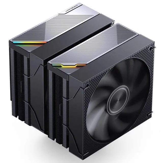 Dual-Tower Design: JONSBO CA90 Black CPU Cooler with 159mm height featuring advanced air cooling technology. [Metallic texture diagonal pull gold-plated grille] [Accented with E-sports aesthetic ARGB lighting effects]