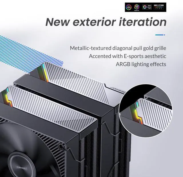 Dual-tower dual-fan : Front-mounted Fan(120mm),Mid-mounted fan (130mm) Newly tuned and optimized heat pipes and fans ,delivers efficient airflow and thermal management for optimal cooling performance
